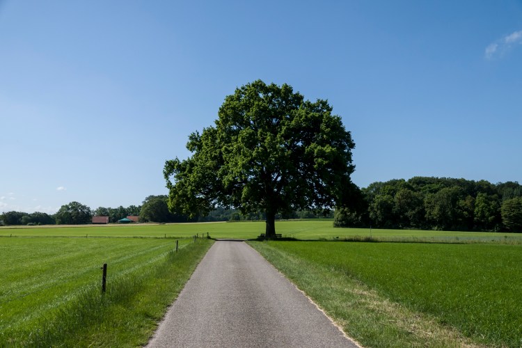 Licht glooiend, een solitaire boom een een bankje. Wil je nog meer?